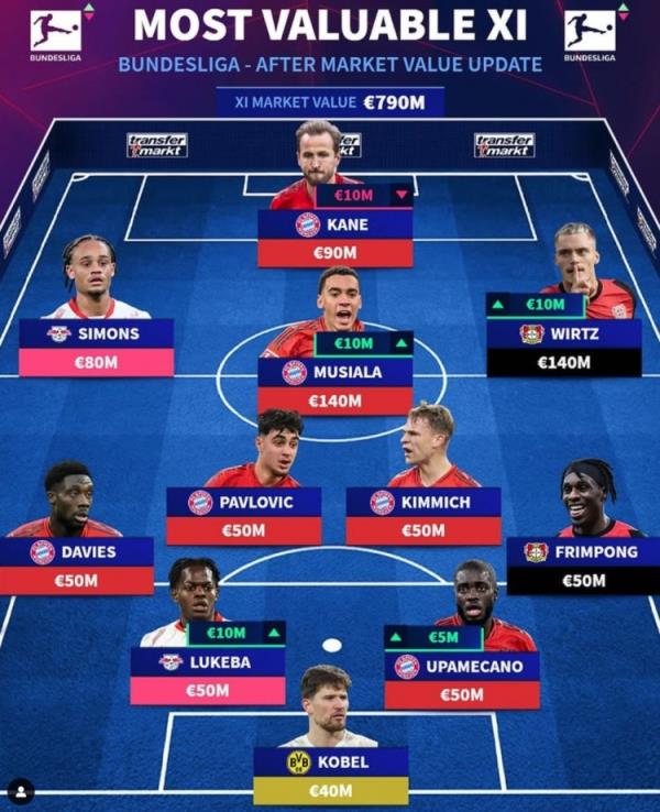 12月20日讯 《转会市场》今日更新了德甲球员身价,并列出了一套德甲最贵阵,拜仁6将在列,莱比锡、药厂各2人。